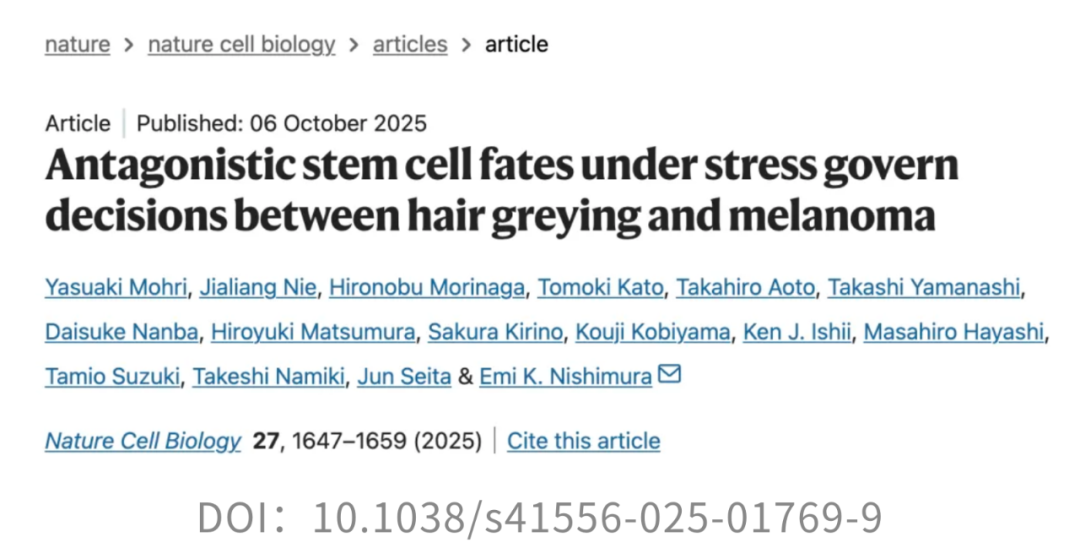 [1]Mohri, Y., Nie, J., Morinaga, H.et al. Antagonistic stem cell fates under stress govern decisions between hair greying and melanoma. Nat Cell Biol (2025). https://doi.org/10.1038/s41556-025-01769-9