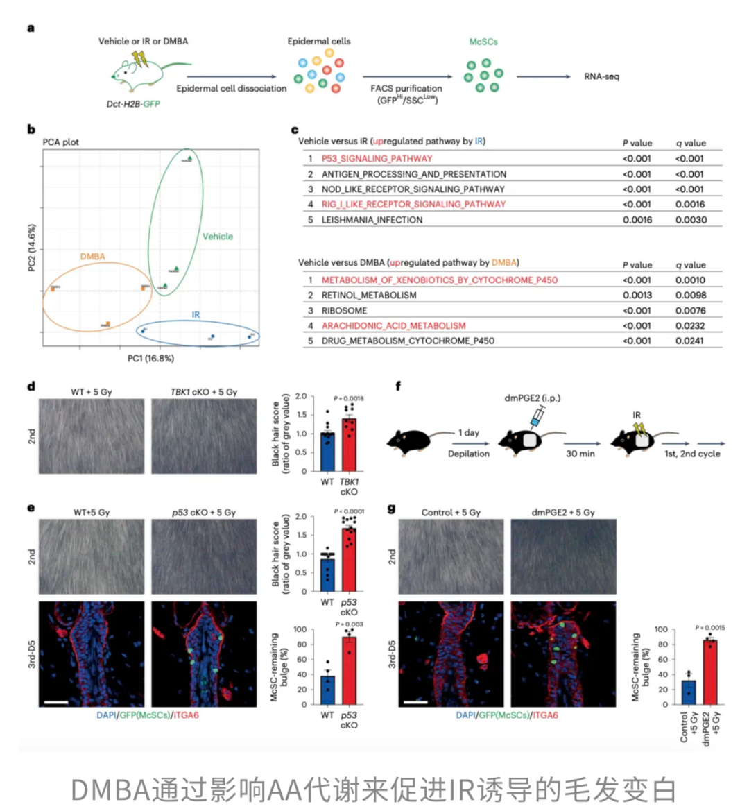 研究显示,IR处理的小鼠毛发迅速变白,而DMBA致癌物处理组却保持乌黑发色。这种差异源于DSBs(双链DNA断裂)的诱导机制:IR造成的严重DNA损伤触发p53–p21自毁程序,而DMBA通过上调AA代谢相关基因(如Cyp1a1、Cyp1b1)拮抗这一通路,维持干细胞活力。