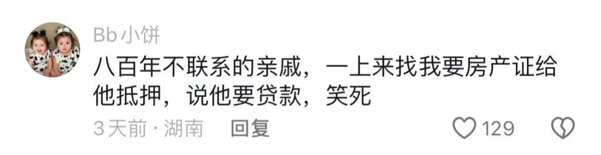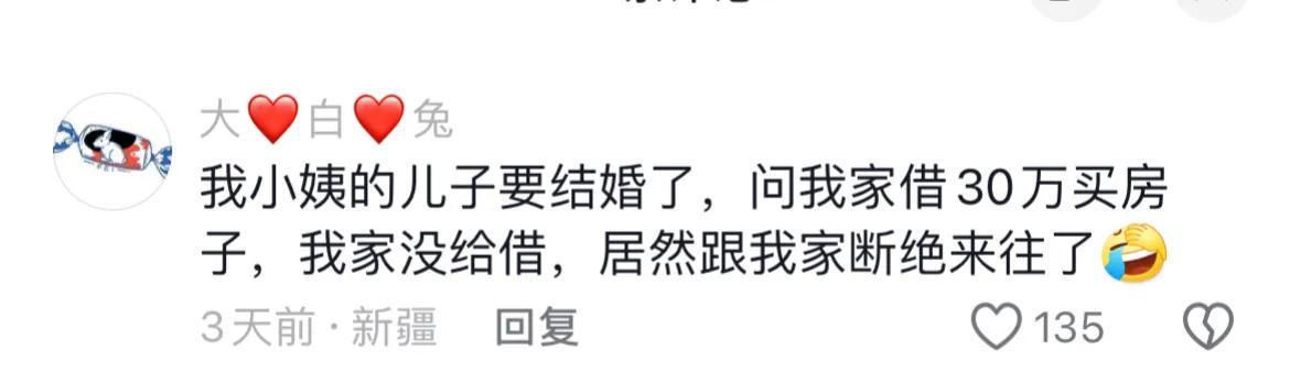 还有网友表示,亲戚们的要求五花八门,有的要求每月给几千元生活费,有的孩子结婚要求送车,甚至有的要求帮忙付首付买房。这些要求让网友直呼“无法理解”,甚至因此过年都不愿去亲戚家拜年。