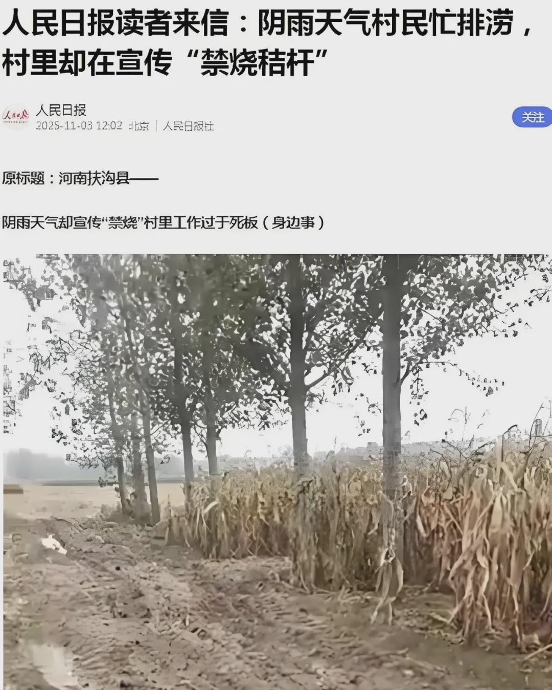 人民日报社(2025-11-03 12:02发布)人民日报读者来信:阴雨天气村民忙排涝,村里却在宣传“禁烧秸秆”