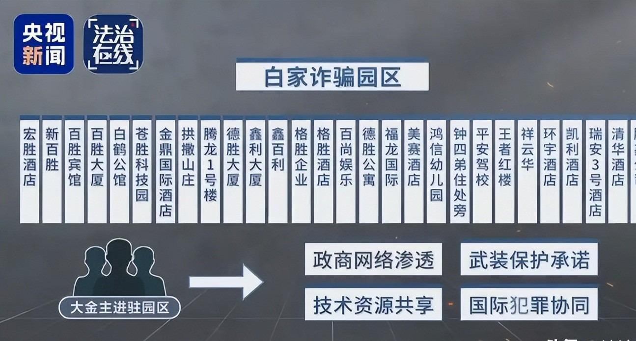 白所成犯下的罪责远不止于此,杀人只是他恶行的冰山一角。他真正的“生意”是靠41个犯罪园区织成的黑网,从百胜宾馆到苍胜科技园,这些挂着“园区”名头的地方,全是电诈、赌场、卖淫的窝点。
