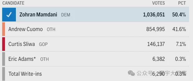 此次选举竞争激烈,计票完成91%时数据显示:马姆达尼(独立候选人身份参选的民主党人)获50.4%选票,民主党人科莫获41.6%,共和党候选人席尔瓦仅获7.1%,现任市长亚当斯得票率0.3%,另有0.3%的'写入'票。值得注意的是,席尔瓦得票率较上次选举暴跌20个百分点,显示大量共和党选民转投科莫,但两人得票率总和仍不及马姆达尼。