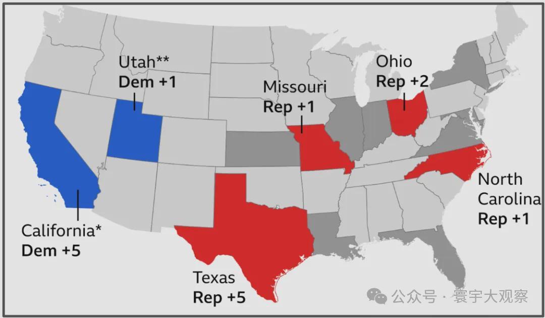 根据美国宪法,联邦众议员席位每十年根据人口普查结果重新分配,但选区划分属各州事务。加州新选区地图将于2030年人口普查后失效,届时将由独立委员会重新划分。当前选区重划趋势在全国蔓延,密苏里州、俄亥俄州、北卡罗莱纳州、犹他州均已完成调整,其中犹他州新地图尚待法院批准。本轮选区调整中,共和党仍保持3个席位优势。