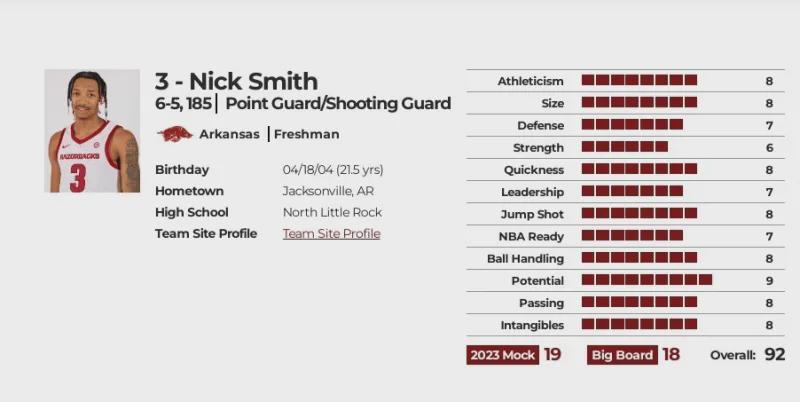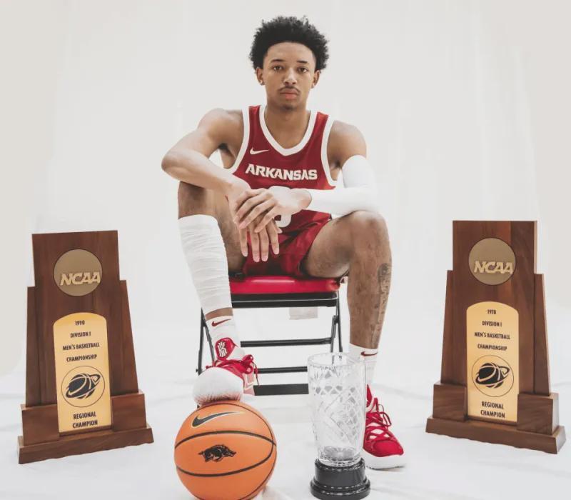 进入阿肯色大学后,小史密斯本应迎来核心地位与光明前景,但命运却给他沉重一击。赛季初的严重膝伤让他缺席半个赛季,复出后表现平平:场均26分钟得到12.5分1.6篮板1.7助攻,三分命中率仅33.8%。在关注度最高的疯狂三月赛事中,他三场比赛分别交出10投2中得6分、4投0中挂蛋、11分的惨淡数据,直接导致选秀声望大跌。
