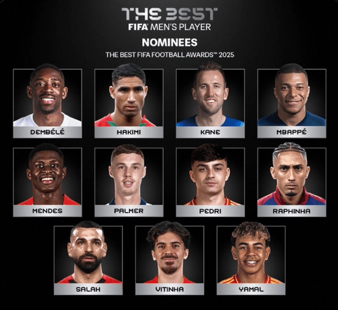 值得注意的是,这11名球员均跻身了今年金球奖的前3名,只有第9位的意大利门神多纳鲁马和第11位的克瓦拉茨赫利亚未能入选这份候选名单。不出意外,金球奖得主登贝莱,以及排名第2的亚马尔,依然会是今年世界足球先生的两大热门得主。