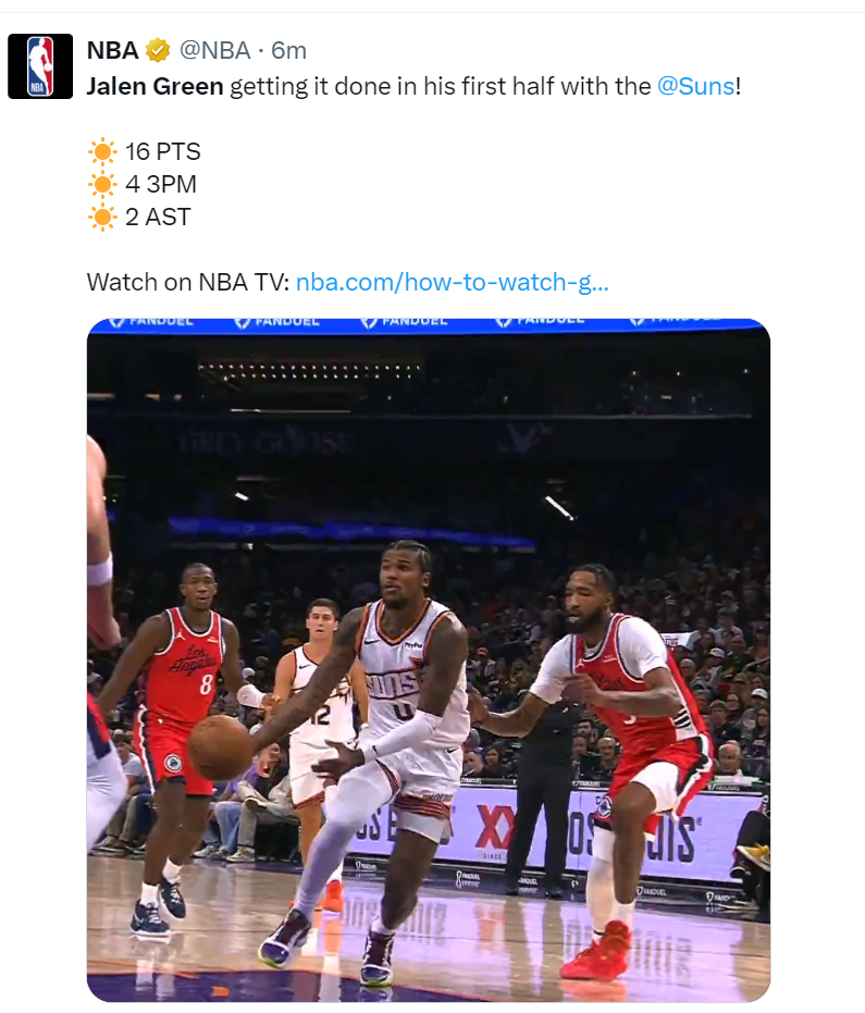 次节比赛,杰伦-格林的发挥依旧稳健。他接布克分球后,外线三分稳稳命中。随后,他又持球突破分球,助攻马威完成暴扣。紧接着,格林底线三分再中,帮助球队反超比分。全场球迷起身为他呐喊助威,气氛热烈。上半场结束,格林仅出战13分钟,便13投6中,三分9投4中,砍下16分2篮板2助攻1抢断,如此高效的表现,也赢得了NBA官方的点赞。