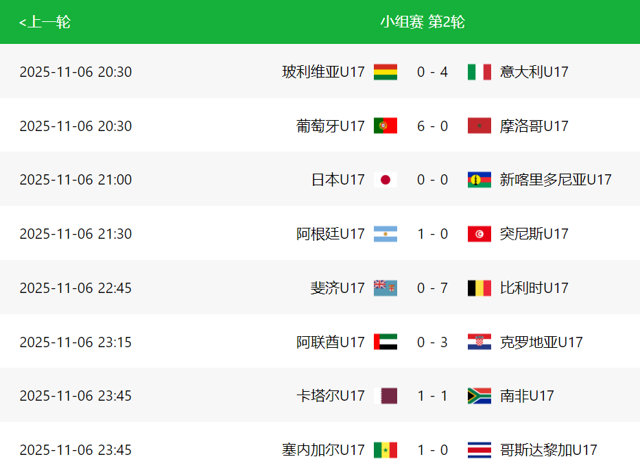 随着日本队被新喀里多尼亚逼平,2轮积4分的他们无缘提前一轮出线。同组的葡萄牙6-0大胜摩洛哥后,2连胜积6分提前晋级淘汰赛。此外,A组的意大利、D组的阿根廷也都是2连胜积6分,提前一轮出线。