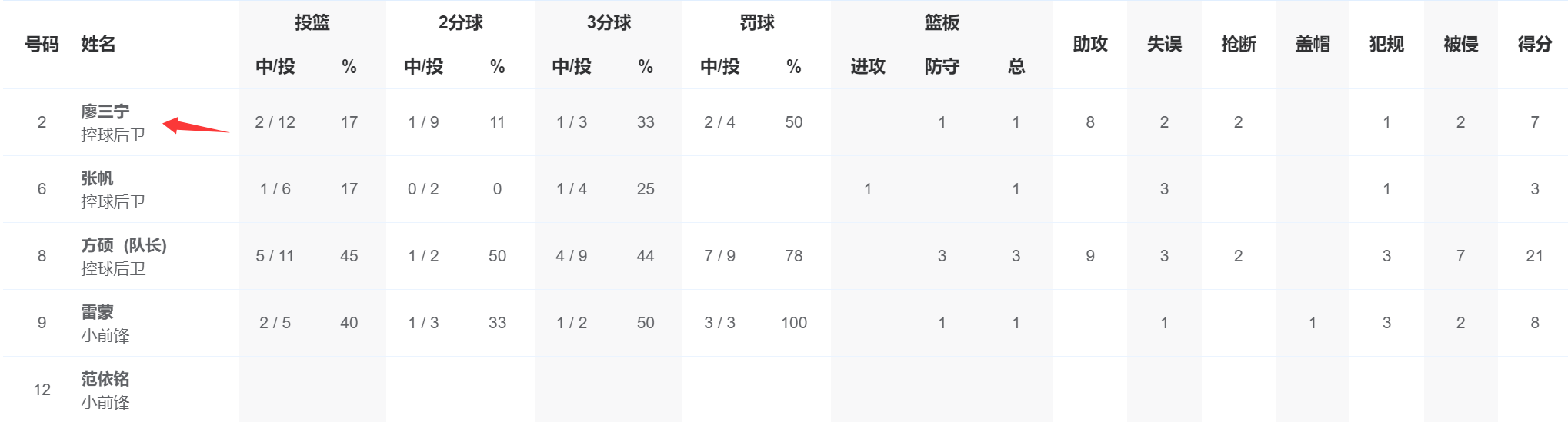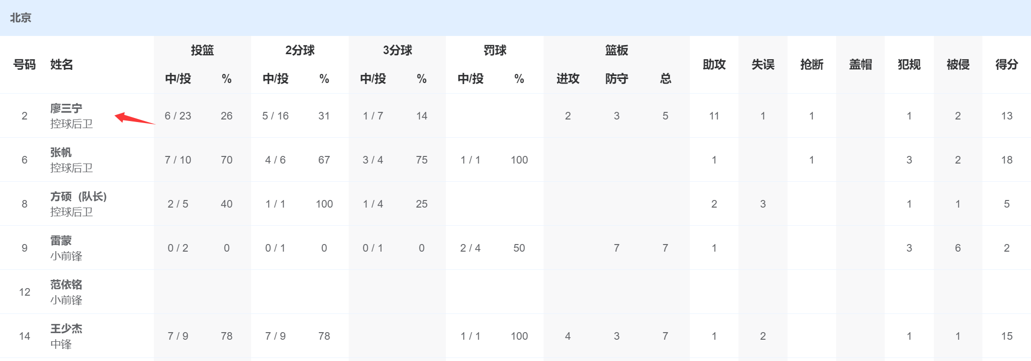 回顾对阵天津的比赛,廖三宁的表现同样令人失望,甚至可以说是输球的最大罪人。末节比赛,他疯狂打铁,助力天津队发起反击。队友伸手要球,他却视而不见,最终交出了23中6、三分7中1的惨淡数据,仅得到13分。