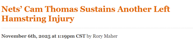北京时间11月7日,据《纽约邮报》资深记者布莱恩-刘易斯最新报道,在昨日篮网对阵步行者队的比赛第一节,球队主力后卫卡姆-托马斯(Cam Thomas)左腿筋再次出现伤情。这已是该部位本赛季第三次出现问题,而上赛季同类型伤病直接导致他仅出战25场常规赛。