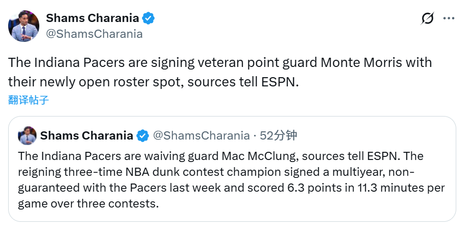 北京时间11月7日,据知名记者Shams报道,印第安纳步行者队正式宣布将裁掉三届扣篮大赛冠军麦克朗,并签下后卫蒙特-莫里斯。据步行者队跟队记者Dopirak透露,莫里斯将与球队签下一份为期一年的非保障合同。