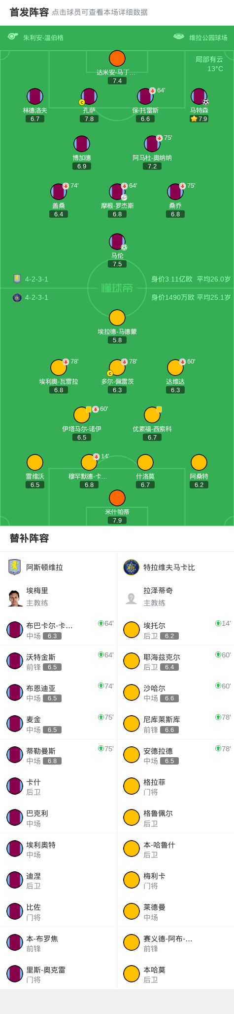 本场比赛,阿斯顿维拉在攻防两端均展现出统治力。全场射门次数、控球率等关键数据均领先对手,最终凭借马特森与马伦的出色发挥,顺利拿下三分。