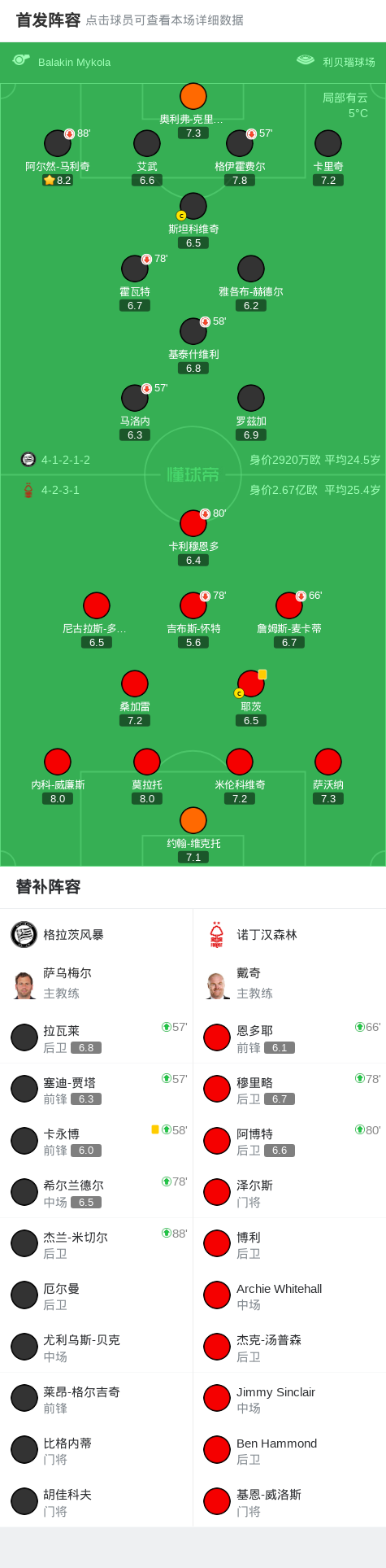 第48分钟,诺丁汉森林球员耶茨拉倒罗兹加犯规,被裁判出示黄牌警告。