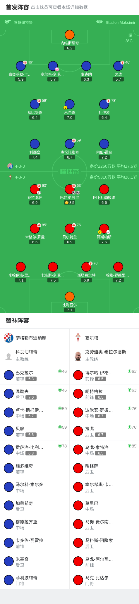 从技术统计来看,塞尔塔在控球率、射门次数和射正次数等关键数据上均占据明显优势。他们全场控球率高达62%,射门次数达到15次,其中7次射正并打入3球。而萨格勒布迪纳摩则显得较为被动,他们全场仅有8次射门,且无一射正。这一数据对比也充分反映了塞尔塔在比赛中的统治力。