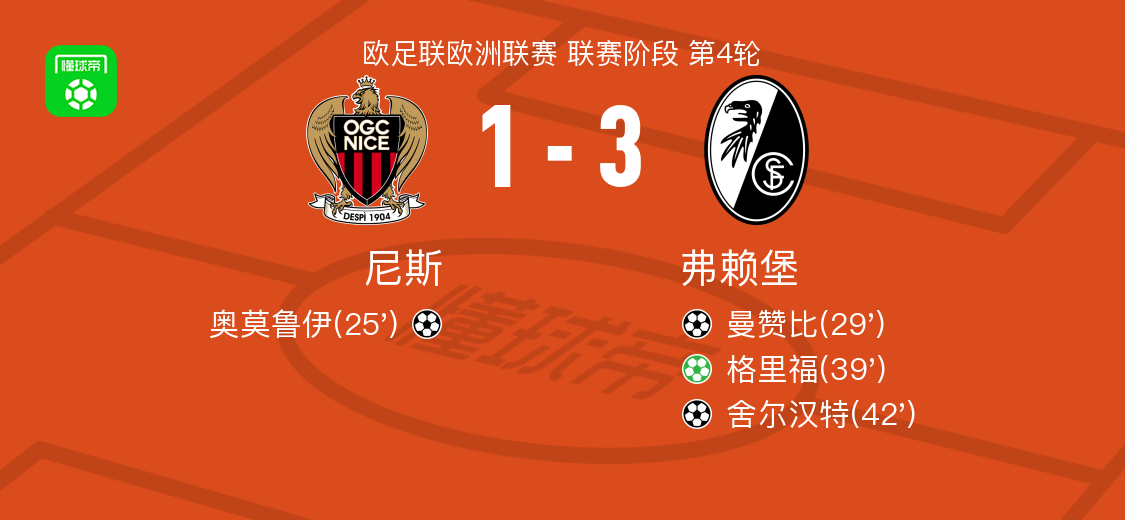 北京时间11月7日凌晨,2025/26赛季欧足联欧洲联赛联赛阶段第4轮迎来焦点对决,德甲劲旅弗赖堡客场3-1逆转法甲球队尼斯,凭借格里福点射、曼赞比与舍尔汉特的进球全取三分。
