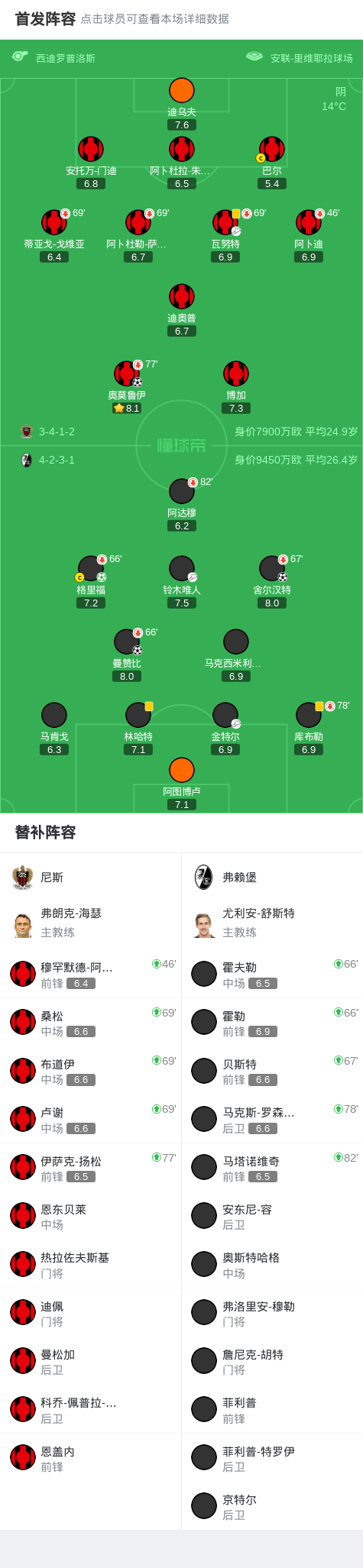 第25分钟,尼斯队率先打破僵局:瓦努特边路送出精准传中,奥莫鲁伊门前抢点破门,主队1-0领先。然而仅4分钟后,弗赖堡便迅速还以颜色——铃木唯人右路突破后横传,曼赞比包抄推射得手,比分扳为1-1。
