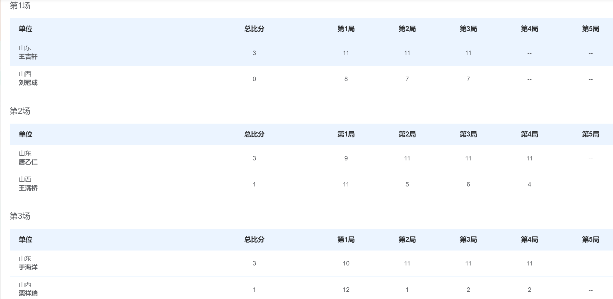 首盘比赛,山东队的王吉轩对阵山西队的刘冠成。王吉轩发挥稳定,以3-0的比分完胜对手,三局比分分别为:11-8、11-7、11-7,为山东队先拔头筹。