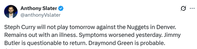 北京时间11月7日,据勇士队权威记者Slater最新报道,金州勇士队当家球星斯蒂芬·库里将因感冒加重继续缺席明日对阵丹佛掘金队的焦点战役。此前库里已因感冒缺席了对阵萨克拉门托国王队的比赛,而其病情在昨日出现进一步恶化迹象。