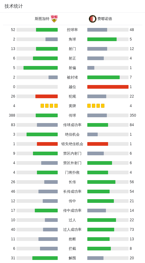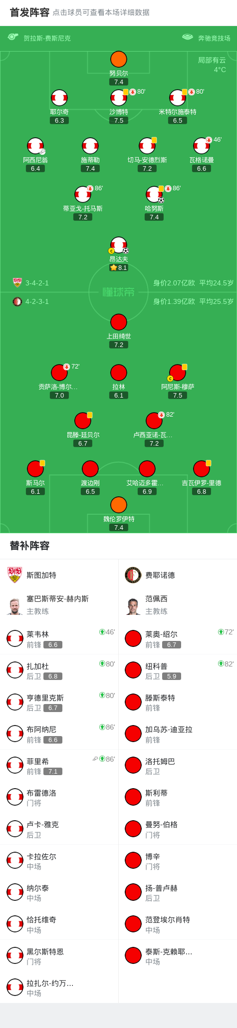 从技术统计来看,斯图加特全场控球率达到58%,射门次数14次,其中6次射正。费耶诺德虽然控球率不低,但进攻效率偏低,全场仅3次射正。斯图加特在防守端也表现出色,成功限制了费耶诺德的核心球员。