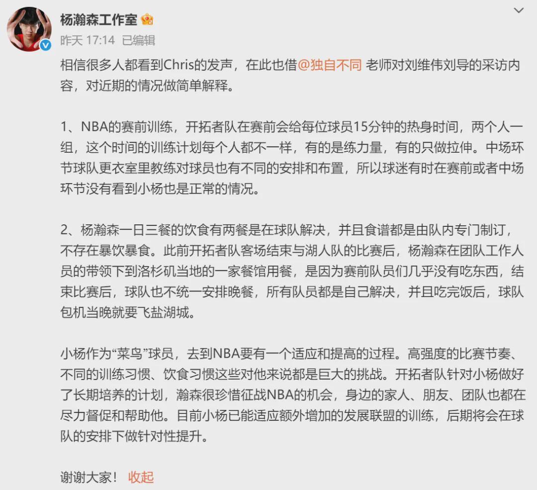 一位开拓者的管理人员在接受中国记者采访时表示:“我理解十几亿人的期望,但是不应该在马拉松刚开始2分钟就陷入焦虑。夏普也花了很长时间,才明白自己应该做什么。”对于外界质疑杨瀚森“吃宵夜、训练懈怠”的言论,他的工作室也进行了正式回应。