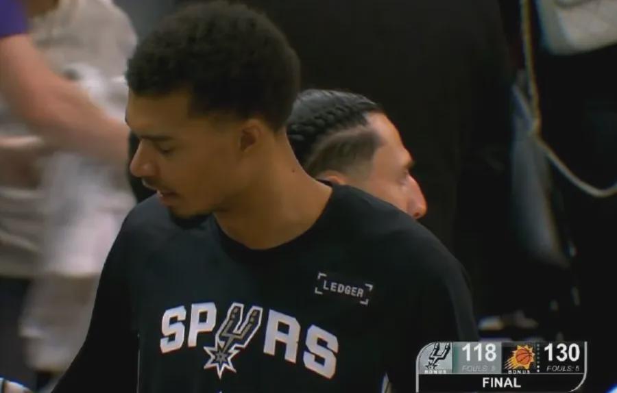 马刺的战绩与文班亚马的表现高度正相关,今日他状态低迷,球队也全场被太阳压制。直到第四节还剩10分钟,文班亚马才通过篮下错位上篮命中个人第二个运动战得分,但此时马刺已大势已去,最终以118-130告负,爆冷输给西部第11的太阳。