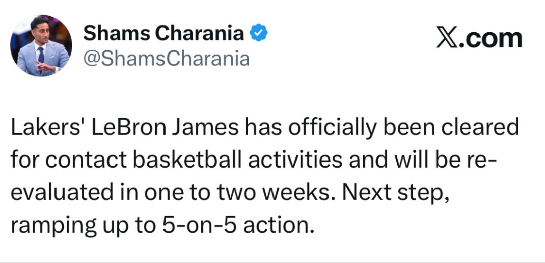 今天,据知名记者Shams的权威消息,詹姆斯已经获准参加5VS对抗训练,预计在1-2周后将重新评估伤情,为复出做准备。