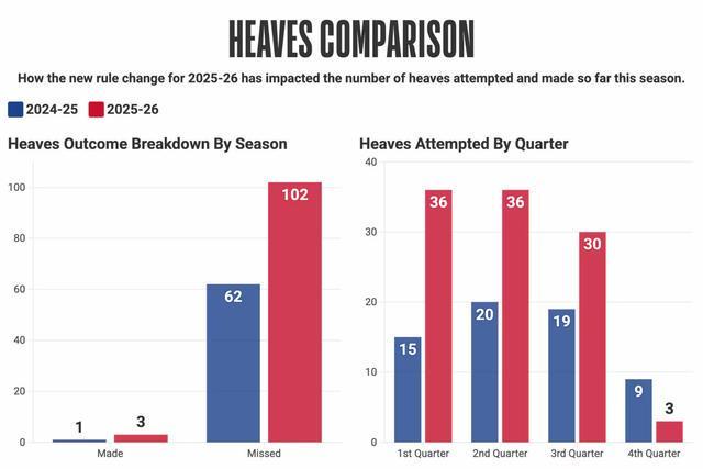 2025-26赛季,NBA对前三节最后三秒内、从后场发起且距离至少36英尺的超远投篮进行了统计变革。这类投篮不再计入球员的个人投篮命中率,无论投中与否,都只计入球队统计。只有投中时,才记为1投1中。这一变化,旨在鼓励球员在关键时刻勇于尝试,减少因担心命中率而错失精彩进球的情况。