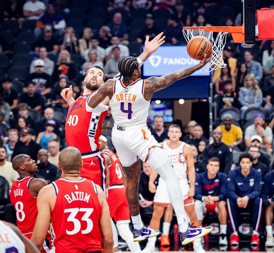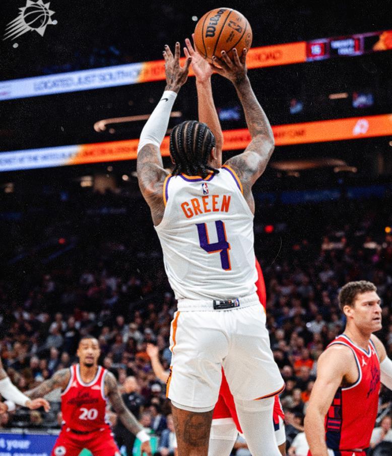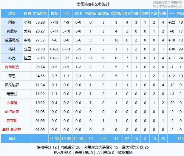 太阳球员数据:格林29分3板3助2断、布克24分6板7助3断、阿伦18分3板4助3断、奥尼尔17分4板2助、威廉姆斯13分10板2断、邓恩10分5板3助、理查兹3分3板