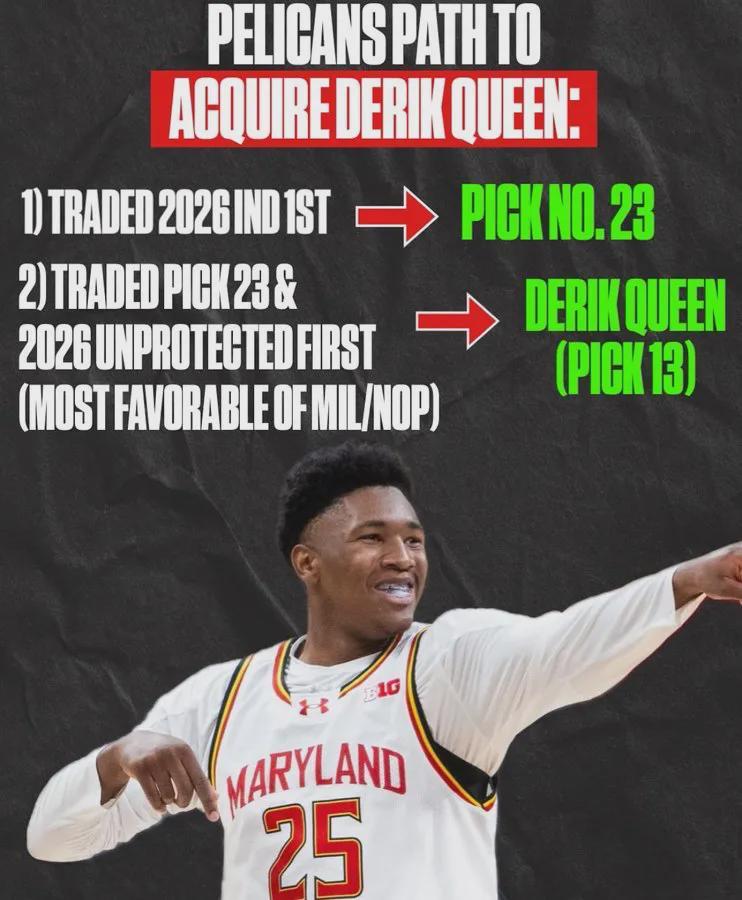 鹈鹕今夏的交易操作确实令人费解。他们先是用来自步行者的2026年首轮签跟步行者换了2025年的首轮第23顺位,再用这个23顺位和自己的2026年首轮签去跟老鹰换了今年的13顺位。最后,他们用这个13顺位选择了中锋德里克·奎因。