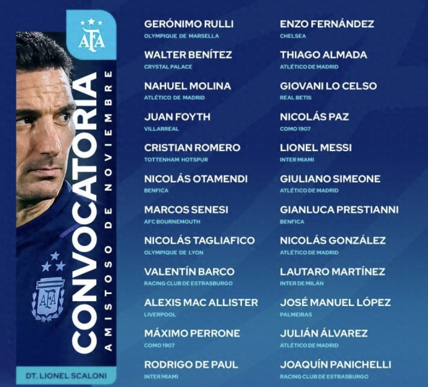 北京时间11月7日,阿根廷国家队正式公布最新一期集训名单。根据国际足联赛程安排,蓝白军团将在本月国际比赛日期间与安哥拉队展开热身赛。在美加墨世界杯开幕前,各支球队的集训机会已所剩无几,每场热身赛都成为检验阵容的关键战役。此次公布的11月名单中,梅西领衔8大前锋出征,普雷斯蒂安尼、帕尼切利两名新星首次入选,而备受关注的苏莱则遗憾落选。