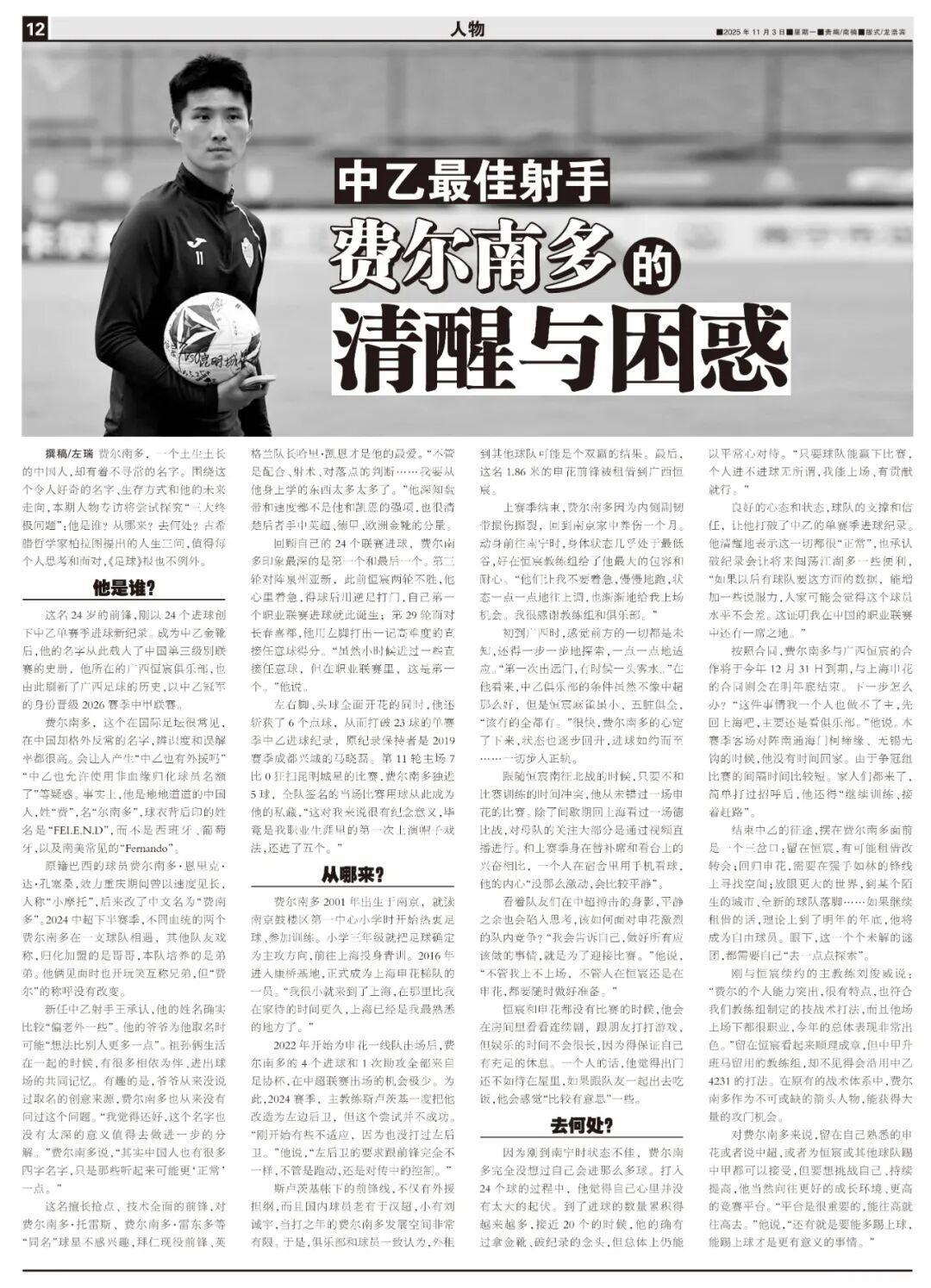 结束中乙征程,费尔南多面临三岔口:留在恒宸(可能租借改转会)、回归申花(需在锋线竞争空间)、或前往陌生球队。若继续租借,明年年底他将成为自由球员。‘这些谜团需要一点点探索。’他说。