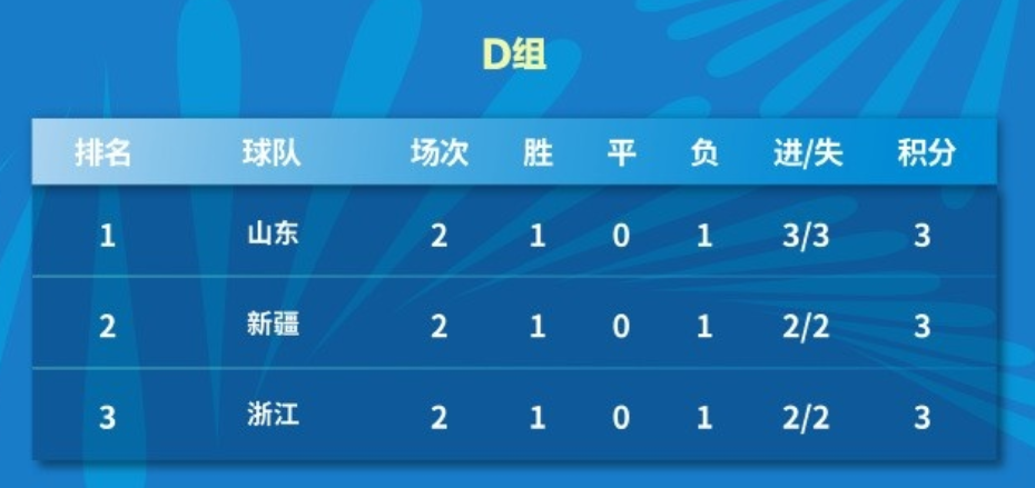全运男足D组共有三支球队,采用单循环赛制,前两名出线。然而,这三支球队在小组赛中却打出了连环套的结果:山东队战胜新疆队,新疆队战胜浙江队,浙江队又战胜山东队。最终,三支球队的积分均为3分,形成了罕见的“三队同分”局面。