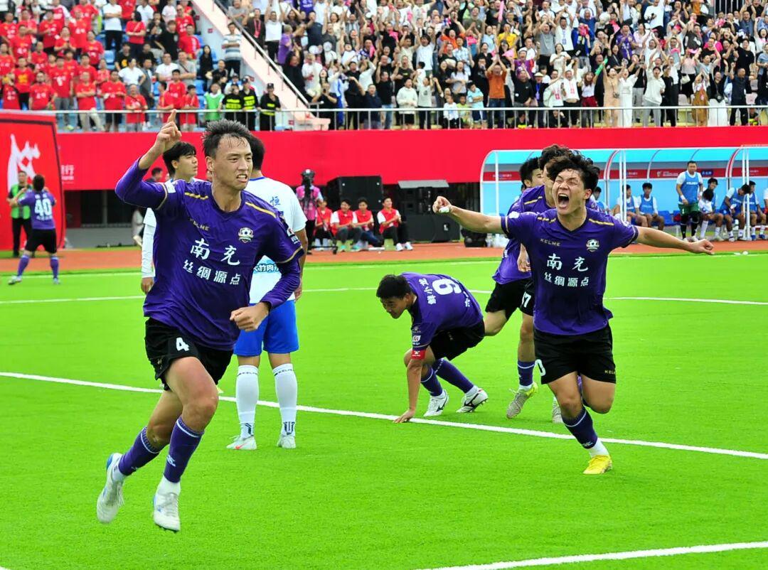 南充队将客场挑战达州队。图为南充队主场对阵达州队,球员进球后庆祝。南充市融媒体中心记者 乐校臣 摄