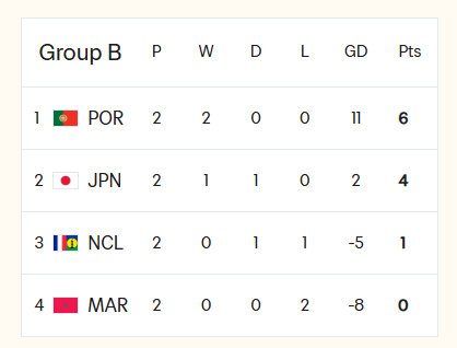 B组:日本和葡萄牙已提前晋级,最后一轮将直接对话争夺小组头名。