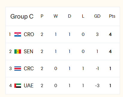 C组:阿联酋垫底,最后一轮必须击败塞内加尔才能出线。