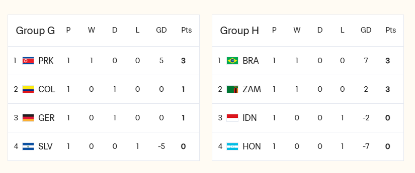 G组:德国仅积1分,巴西大胜洪都拉斯基本出线,印尼1-3落败晋级希望渺茫。