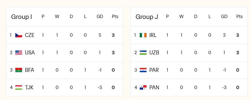 I组:塔吉克斯坦1-6惨败捷克,出线基本无望。
