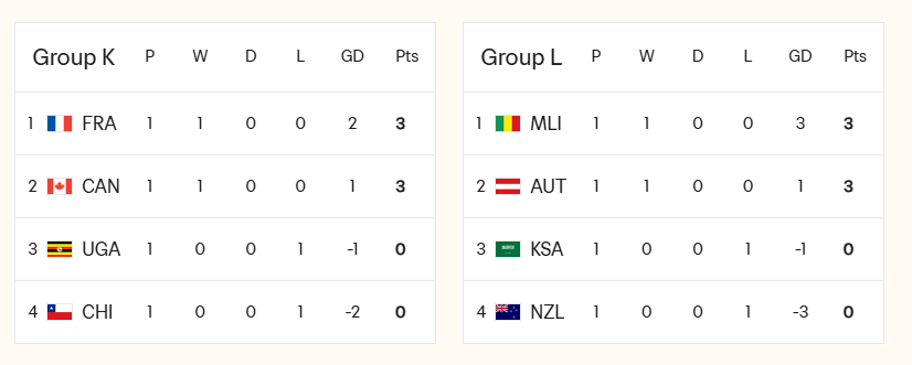 K组:法国和加拿大均取得胜利。