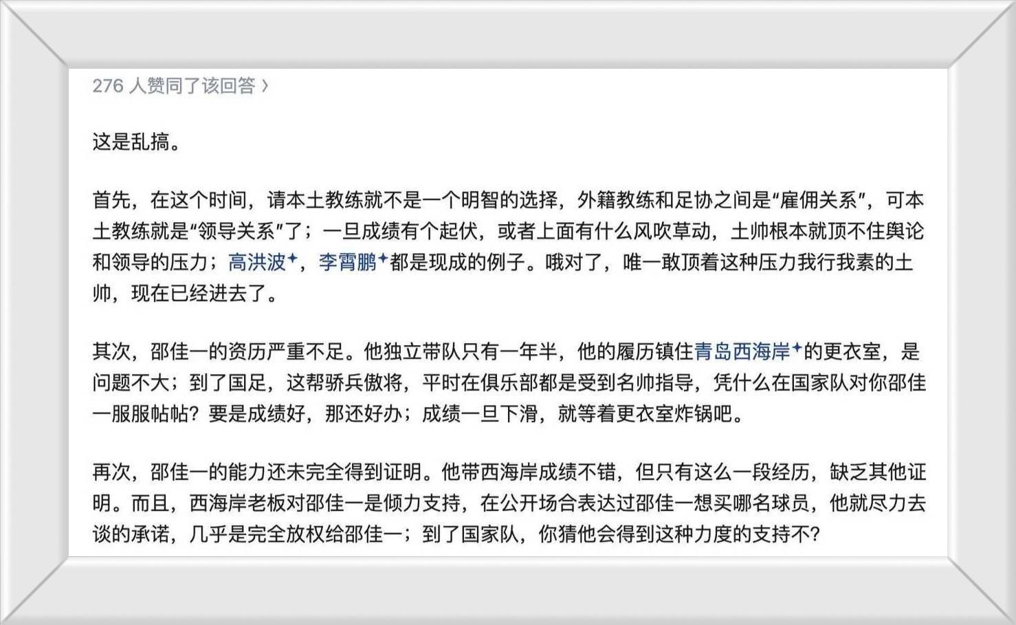 就在邵佳一成为主帅后的第二天,就有球迷提出质疑,并得到了不少网友的赞同。