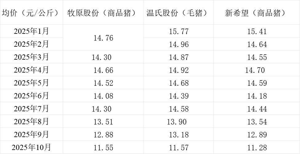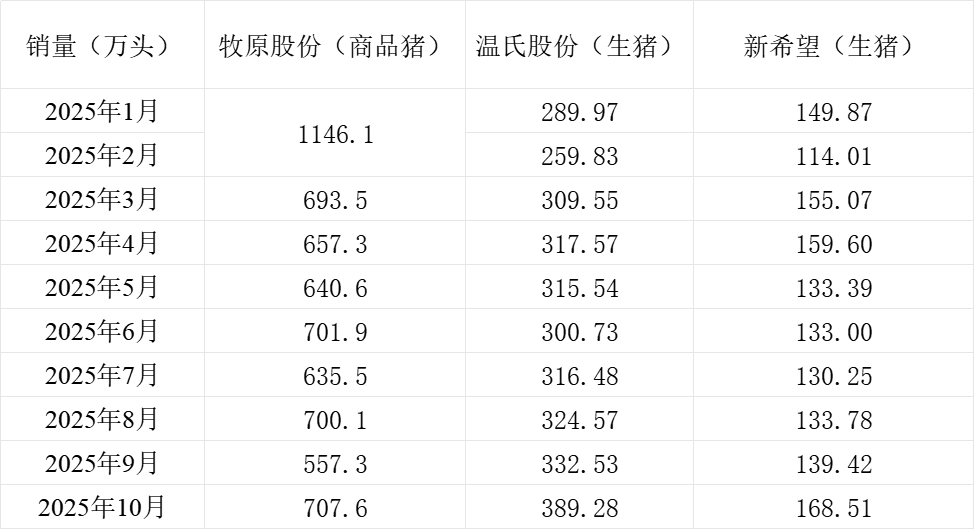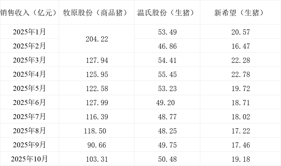 近日,牧原股份(002714.SZ)、新希望(000876.SZ)、温氏股份(300498.SZ)三大上市猪企陆续发布了2025年10月的生猪销售数据。数据显示,尽管生猪销量同比均实现增长,但受猪价同比大幅下降影响,销售收入却出现下滑。