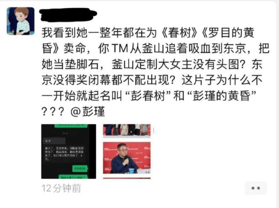 其一,未获得东京国际电影节最佳女演员奖;其二,电影节尚未结束便被通知可提前回国,这让她联想到此前在釜山电影节《落幕的黄昏》之行中,自费参与却未出现在宣传物料上的遭遇,感觉自己被制作团队边缘化;其三,制片人与隐身导演张律被指“过河拆桥”,当初找她救场参演两部电影时卖惨称要赚钱给妻子治病,结果电影拍完后却如此对待她。