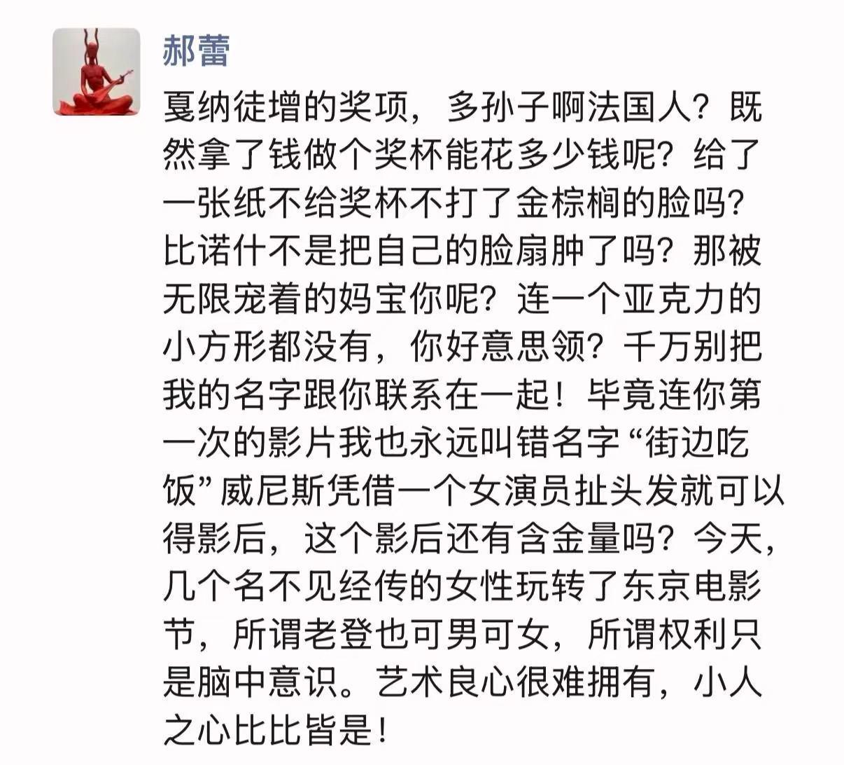 在评审文晏、演员叶璇先后发声后,郝蕾也加入讨论,她发布的朋友圈内容更为尖锐。