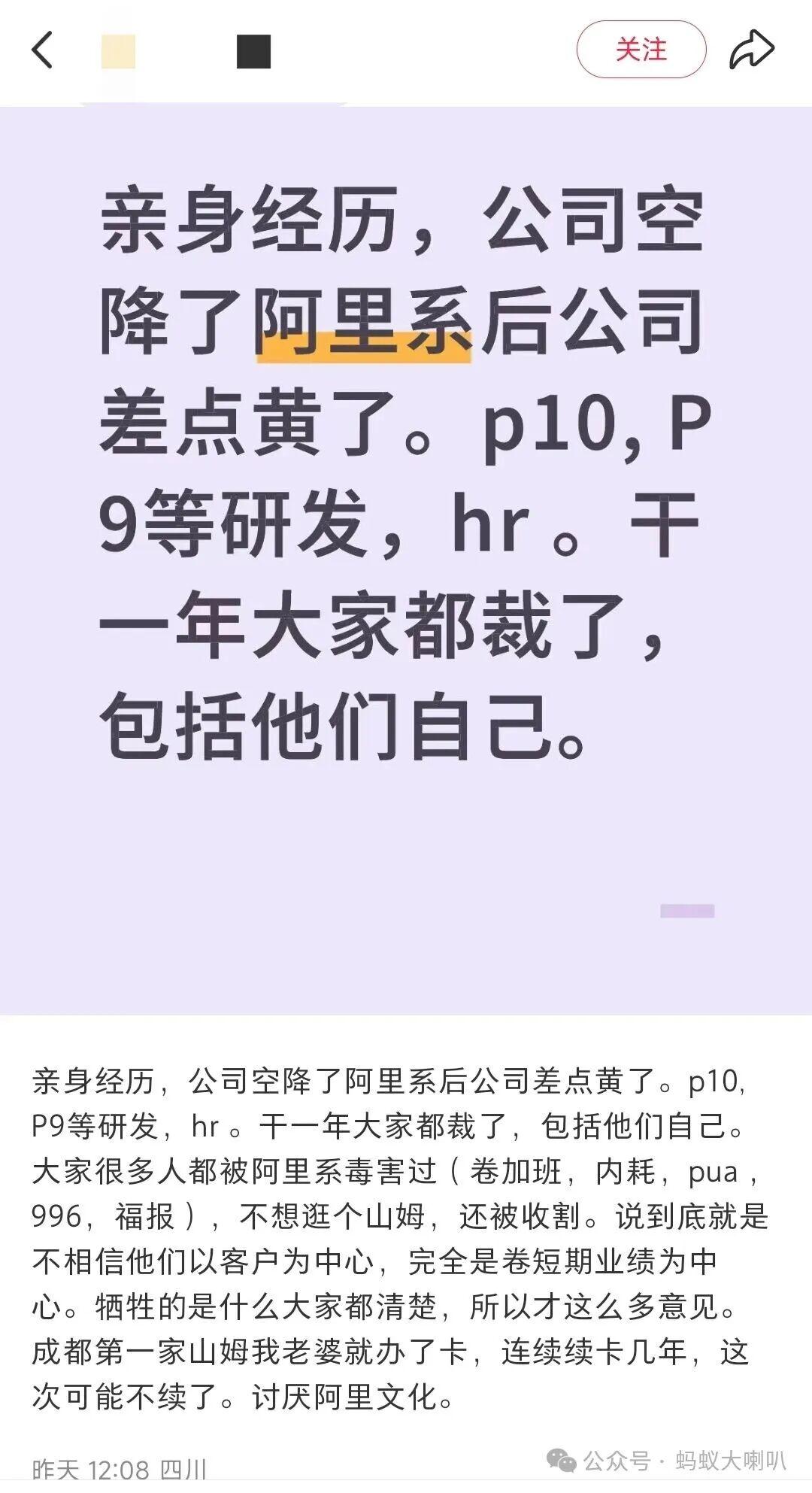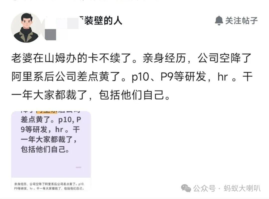 这其中,大喇叭看到一位网友发文:自己的亲身经历,公司空降了阿里系p10、P9等研发和hr后公司差点黄了。干了一年大家都裁了,包括他们自己。大家很多人都被阿里系“毒害”过(卷加班,内耗,pua,996,福报),不想逛个山姆,还被收割。说到底就是不相信他们以客户为中心,完全是卷短期业绩为中心。牺牲的是什么大家都清楚,所以才这么多意见。成都第一家山姆我老婆就办了卡,连续续卡几年,这次可能不续了。