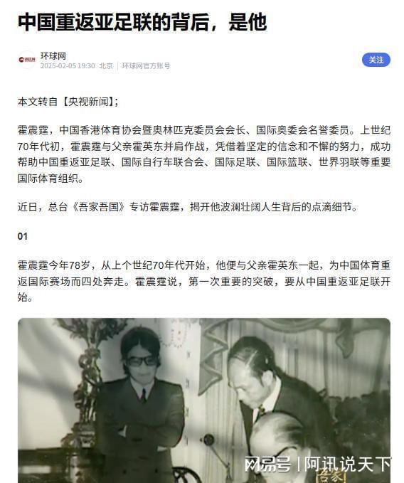 早年间,国家在体育领域的声量还十分微弱的时候,霍震霆就主动站出来,游说各方力量,帮助中国足协重返亚足联,让中国体育重新回到国际舞台,这样的贡献可不是小事。