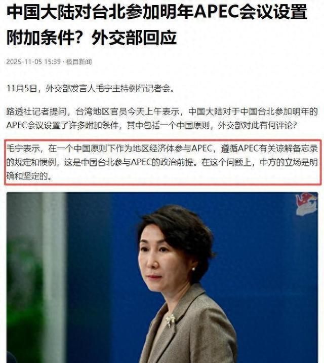 澎湃新闻:《台当局官员称中国大陆对中国台北参加APEC设置许多附加条件,外交部回应》2025年11月5日