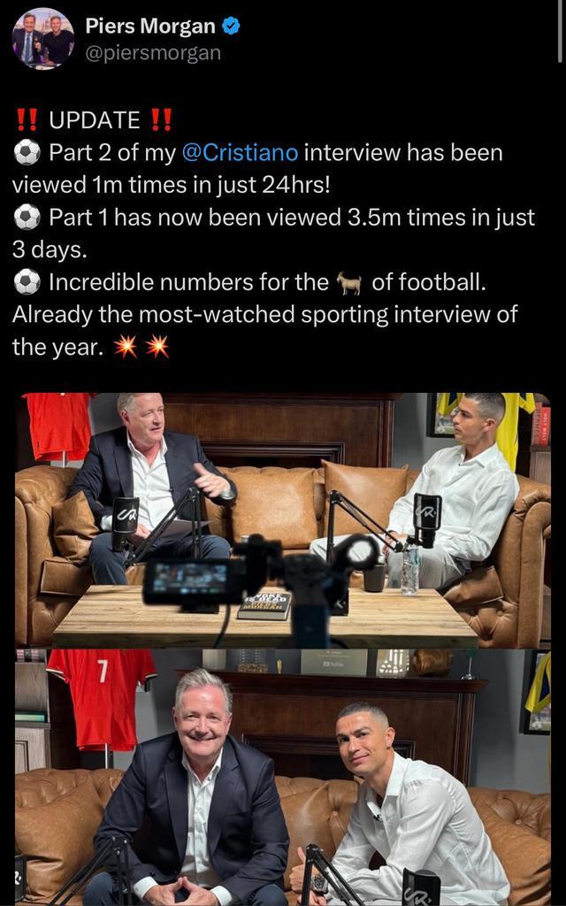 根据摩根公开的数据显示,专访第二部分内容上线仅24小时便斩获超100万次观看量,而第一部分内容更是在发布三天内累计突破350万次观看。这一数据不仅刷新了足球领域访谈类节目的收视纪录,更力压同期所有体育类采访内容,稳居年度观看量榜首。摩根在社交媒体发文强调:"这样的数据在足球史上堪称奇迹,充分证明了C罗的全球影响力。"