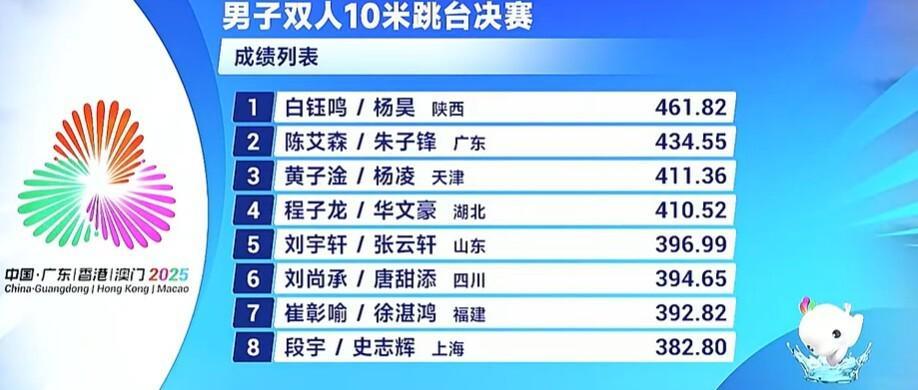 经过激烈的角逐,陕西队组合白钰鸣/杨昊以461.82分的成绩轻松摘金,展现了强大的实力与默契。广东队选手陈艾森/朱子锋则以434.55分的成绩获得银牌,他们的表现同样值得称赞。而天津队选手黄子淦/杨凌则以411.36分的成绩获得铜牌,为他们的努力与付出画上了圆满的句号。