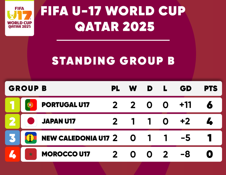 值得一提的是,这是新喀里多尼亚在U17世界杯历史上获得的第2个积分。他们的首个积分同样来自于对阵日本队——2017年10月,他们曾以0-0逼平日本队。8年内第2次在U17世界杯赛场逼平日本,新喀里多尼亚创造了属于自己的奇迹。两轮比赛过后,葡萄牙以两连胜领跑B组积分榜,日本队则以1胜1平的成绩暂列第二位。