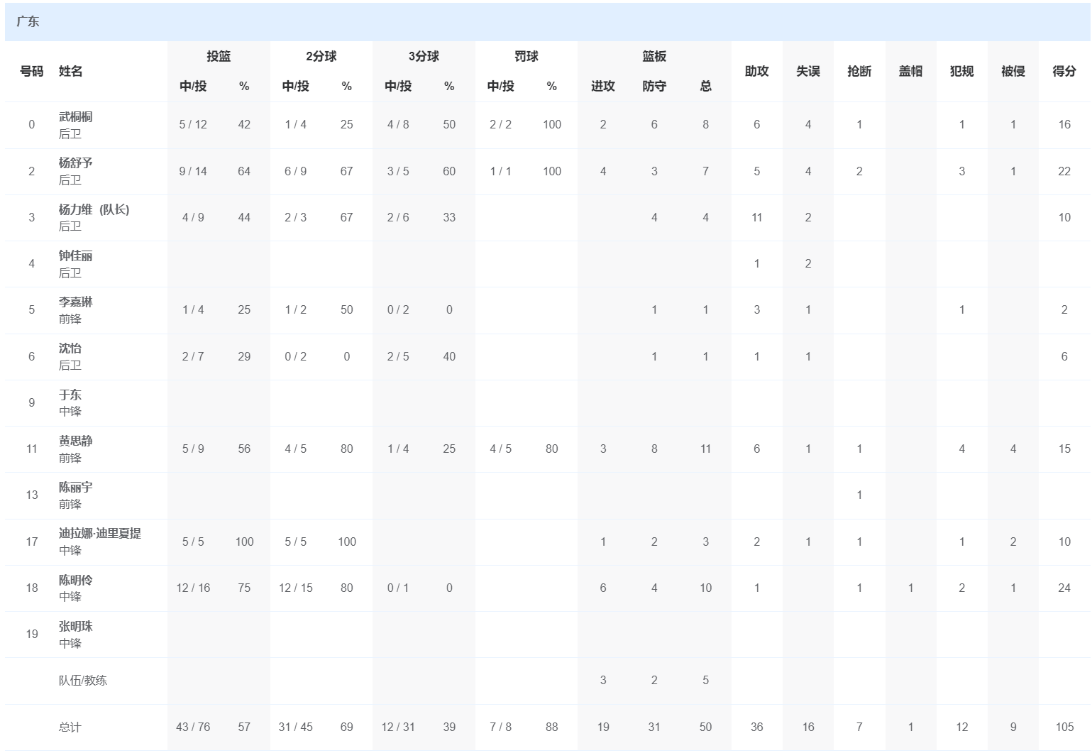 其他主力表现同样亮眼:杨舒予33分钟14中9(三分5中3)得22分7篮板5助攻;杨力维27分钟9中4(三分6中2)贡献10分11助攻;黄思静21分钟9中5(三分4中1)拿下15分11篮板6助攻;武桐桐31分钟12中5(三分6中4)得到16分8篮板6助攻。