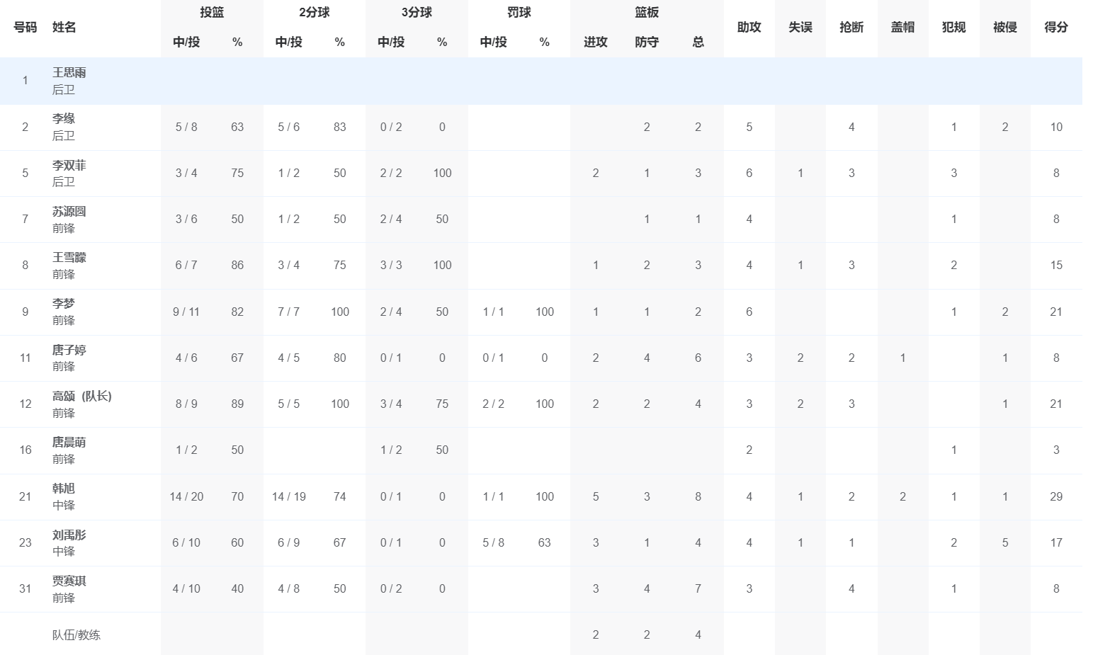 本场比赛,李梦、韩旭、高颂均砍下20+的得分,四川队的硬实力可见一斑。在全运会资格赛中,李梦场均出战20分钟,就能贡献15分5.2助攻2.2篮板0.8抢断,命中率高达63.4%,三分命中率也有25%,可谓是小试牛刀。来到正赛,她才真正开始大杀四方。
