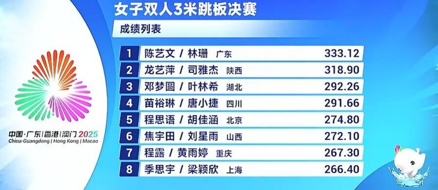 陕西队组合龙艺萍/司雅杰表现稳健,五跳中有四跳成绩排名第二,最终以318.90分获得银牌。铜牌争夺异常激烈,湖北队邓梦圆/叶林希以292.26分,仅以0.60分的微弱优势力压四川队,成功摘得铜牌。